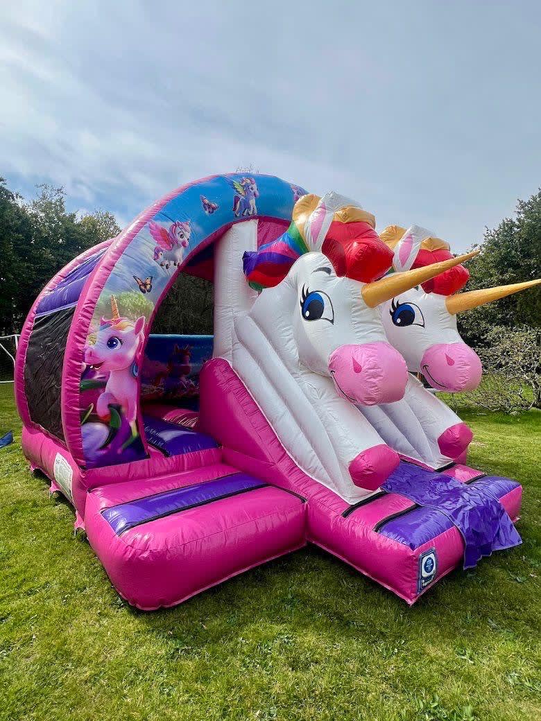 Our Mega Unicorn Bounce n Slide will be a sure hit with your little ones. The 3D Unicorn slide adds another dimension of fun to this amazing bouncy castle and always proves to a be a real head turner. This inflatable is suitable for children upto the age of 16 years old.... but is a popular choice for toddlers and younger children due to to the low access height and an open front for an unobstructed view of your children. It is a large sized castle and although it will fit in most indoor venues, please be sure to double check your available space. This castle is a real show stopper with the unicorn slide and also goes well as part of our amazing unicorn package.
