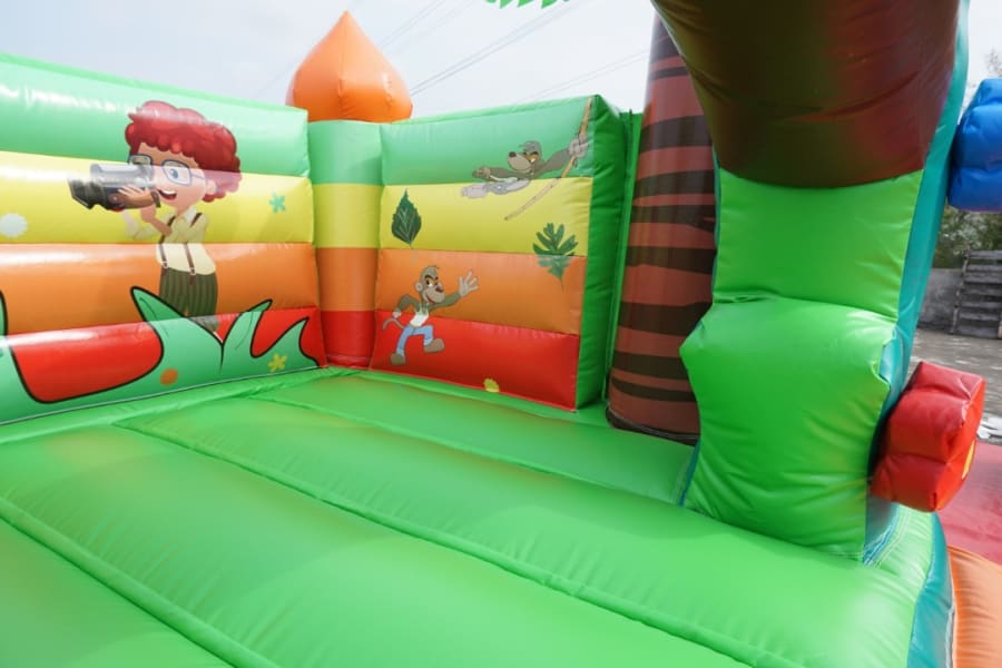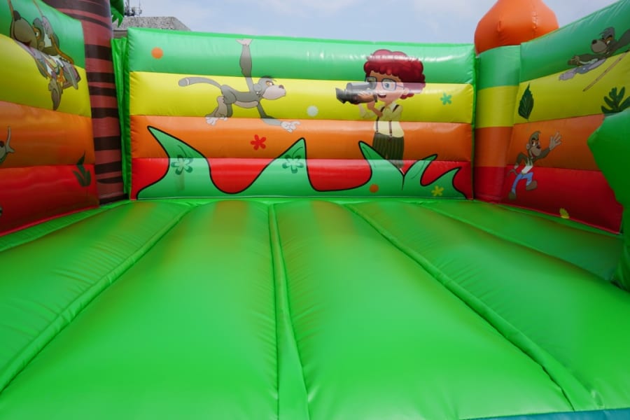 Your little explorers can be bouncing around this beautifully designed Jungle Land bouncy castle.This bouncy castle is suitable for children up to the age of 12 years old.... but is a popular choice for toddlers and younger children due to to the low access height and open viewing area. It is a medium sized castle and will fit in most indoor venues, but please be sure to double check your available space. With the whole scenario of the monkeys and palm trees, this castle goes well as part of our amazing jungle package.