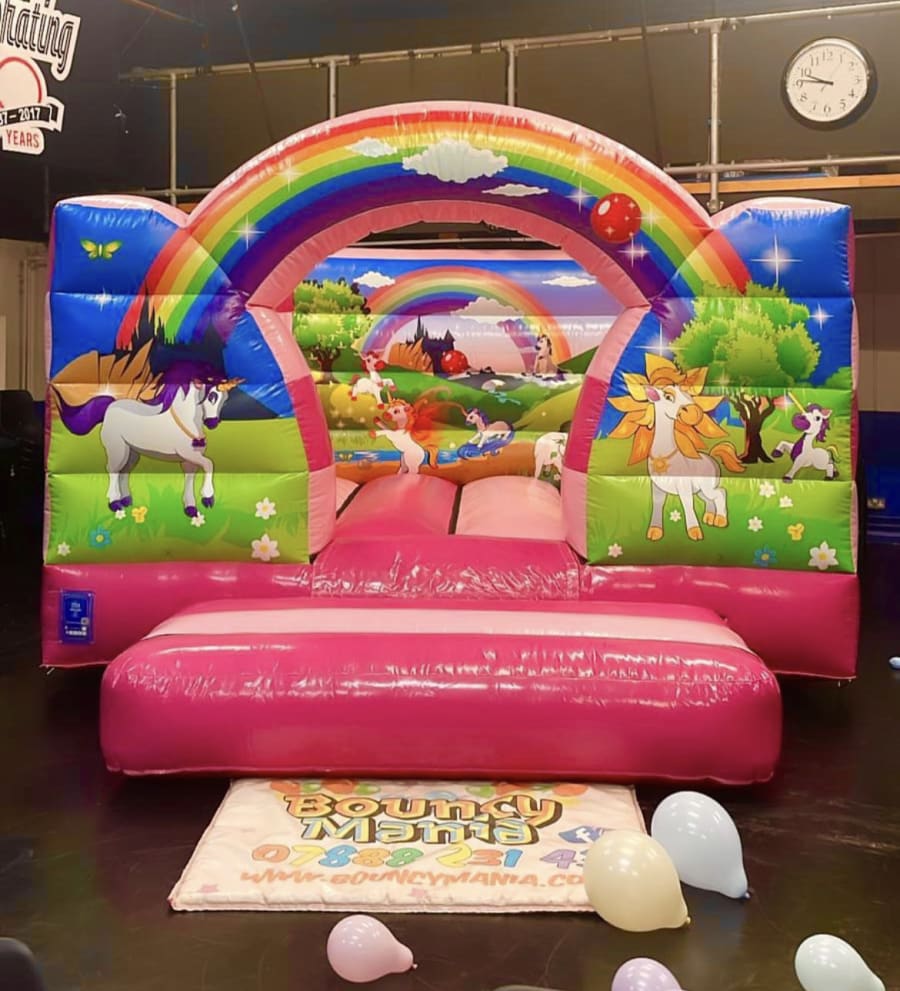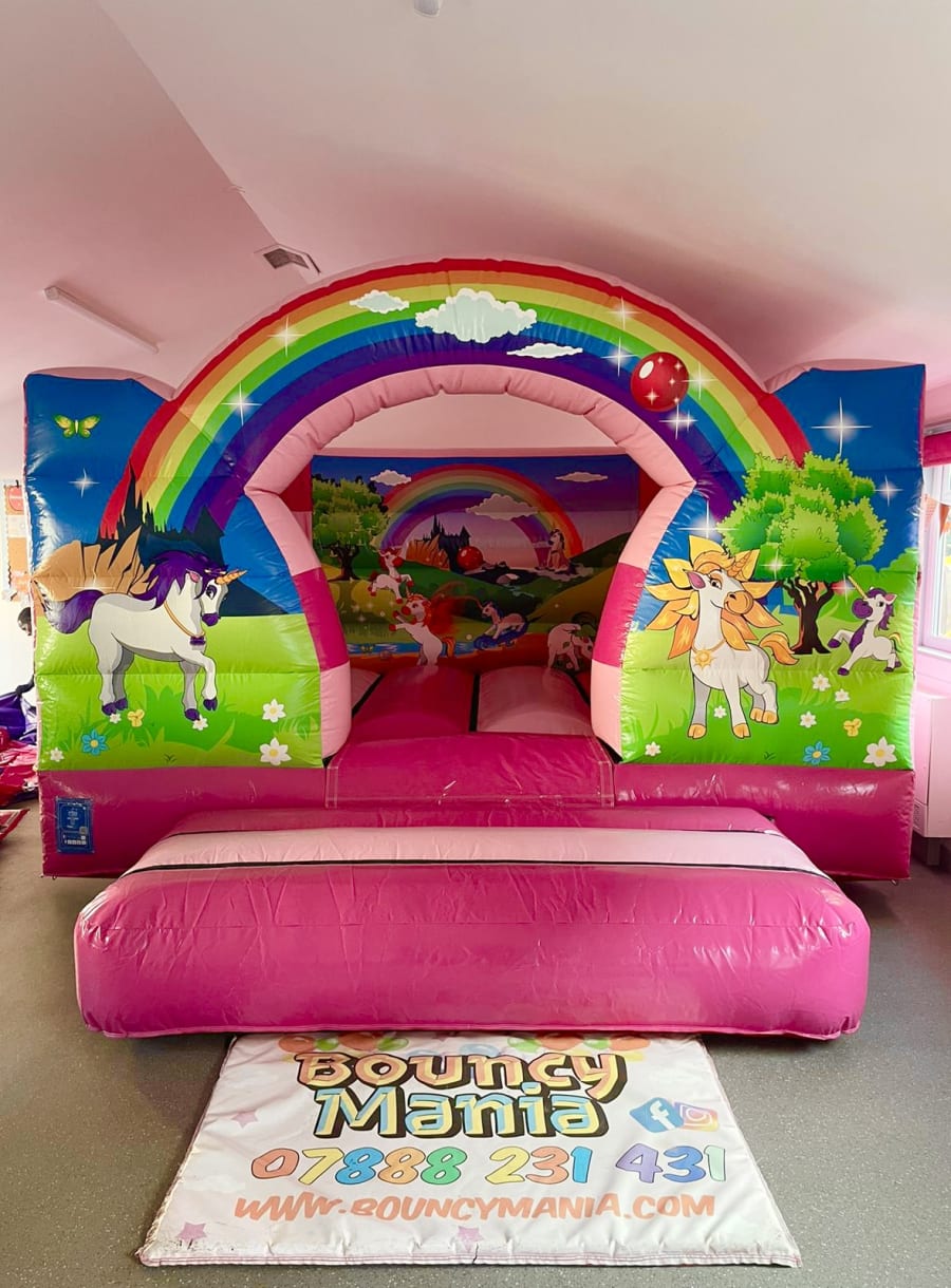 We have a number of unicorn castles and this is another low height castle which is perfect for outdoors and also indoors. The vibrant colours of the rainbow and the unicorn makes it stand out at any party. Why not complete the set by adding the matching unicorn Air Juggler and soft play.